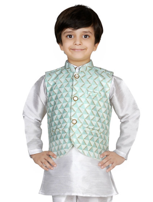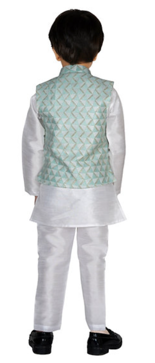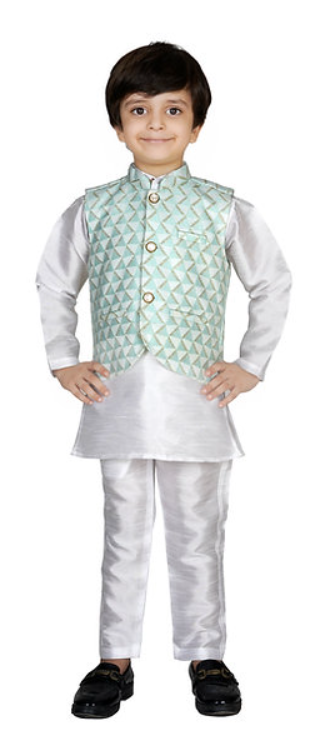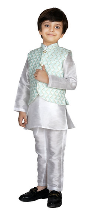 Elevate his ethnic wardrobe with theĀ Moonstone Majesty Set. Crafted in luminous white, this 3-piece outfit blends sophistication with comfort. The structured jacket adds a regal edge to the classic kurta-pajama, making it the ultimate outfit for special occasions.