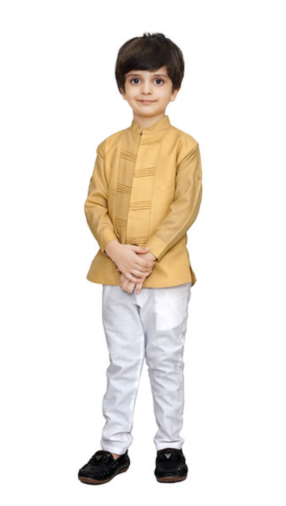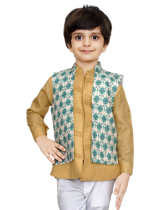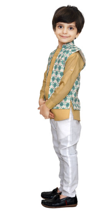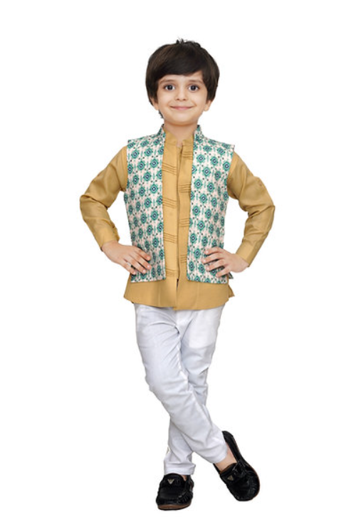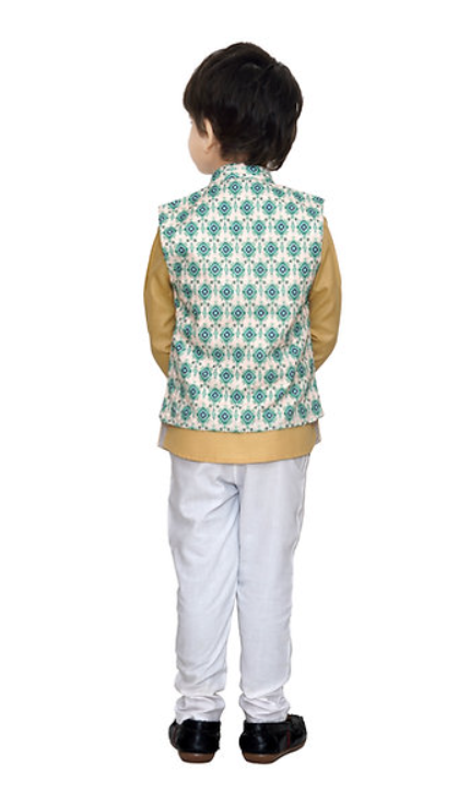 Brighten up any celebration with this mustard kurta paired with a vibrant printed Nehru jacket and classic white bottoms. A cheerful choice for little ones to steal the spotlight at weddings, parties, or festive get-togethers.