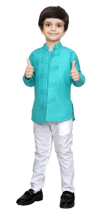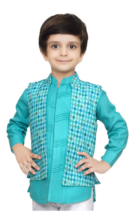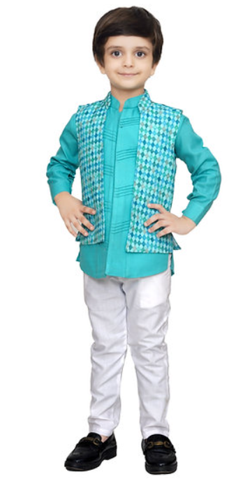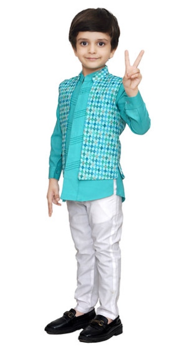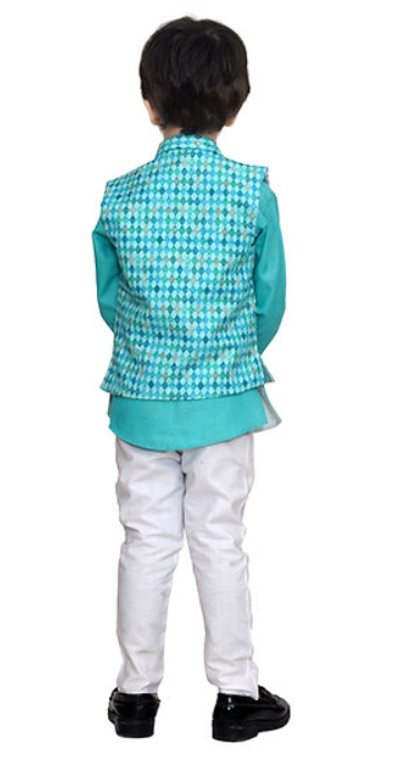 A bright turquoise kurta paired with a diamond-patterned Nehru jacket, this vibrant set brings the perfect mix of playful energy and festive flair for your little one’s special moments.
